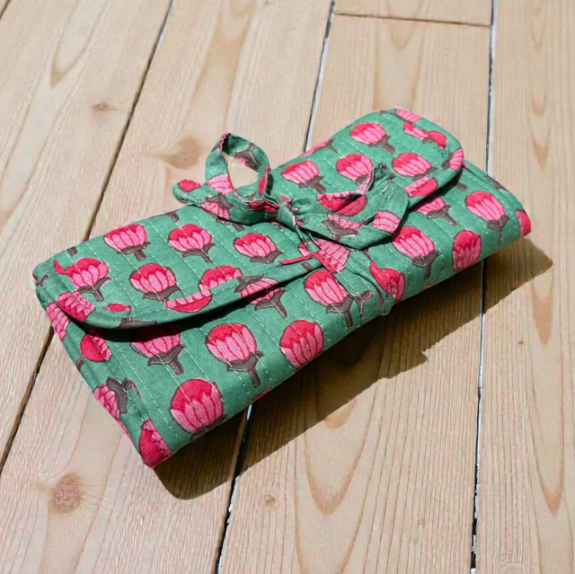 Perfecto para viajar o para diario. Cuenta con tres bolsillos internos con cremallera para guardar tus joyitas o tarjetas. Se cierra mediante lazada.