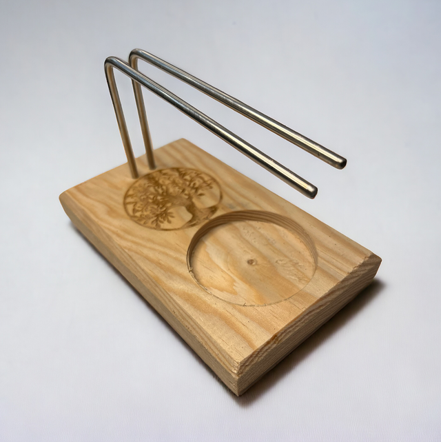Soporte de madera para quemar palo santo aunque también funciona bien para quemar sahumerios, ya que las varillas de metal regulan el tamaño de lo que se coloca.
